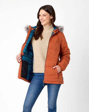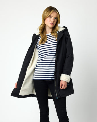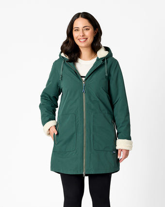 Flattering silhouette, ultra warm sherpa fleece lining, longer length and a waterproof shell for all weather protection.